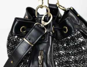 A medium-sized drawstring bag proves to be the perfect companion for your on-the-go lifestyle. It has a soft silhouette with a structured base and it features two types of handles. A short handle and a long adjustable strap, both detachable. The two exterior side zippered pockets are very handy for your phone, glasses, or anything else you want to have quick access to.
