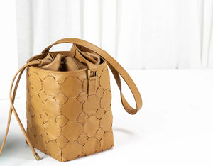 This handwoven leather bucket bag, is crafted with precision and care. Its square shape exudes modern elegance, while the drawstring closure on top adds a touch of functionality. Complete with a long adjustable buckle strap, this bag offers versatility and style.