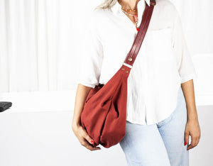 Η crossbody hobo τσάντα Kallia είναι φτιαγμένη από βαμβακερό καμβά σε κεραμιδί με λεπτομέρειες από αρνί δερμα. Διαθέτει αποσπώμενα δερμάτινα μέρη και φερμουάρ, ώστε να καθαρίζεται και να προσαρμόζεται εύκολα στο στυλ σου. Ευρύχωρη και κομψή, ιδανική για καθημερινή χρήση ή σύντομες αποδράσεις