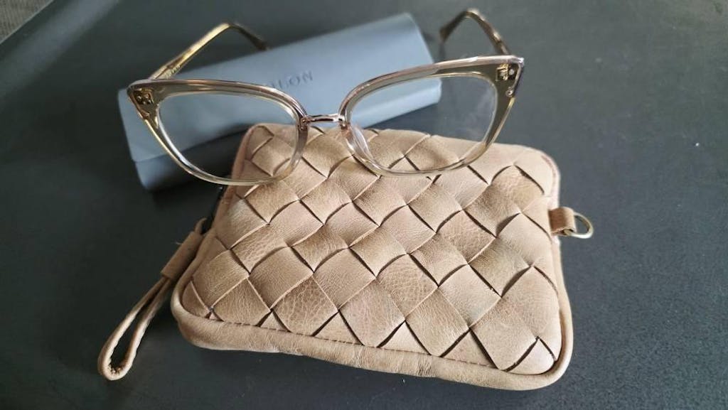 Close-up of a black leather pouch with a floral pattern on the interior lining.
