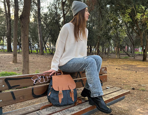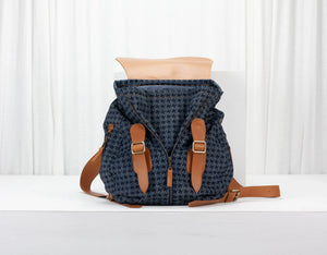 Artemis backpack - Blue denim with houndstooth print and Brown leather